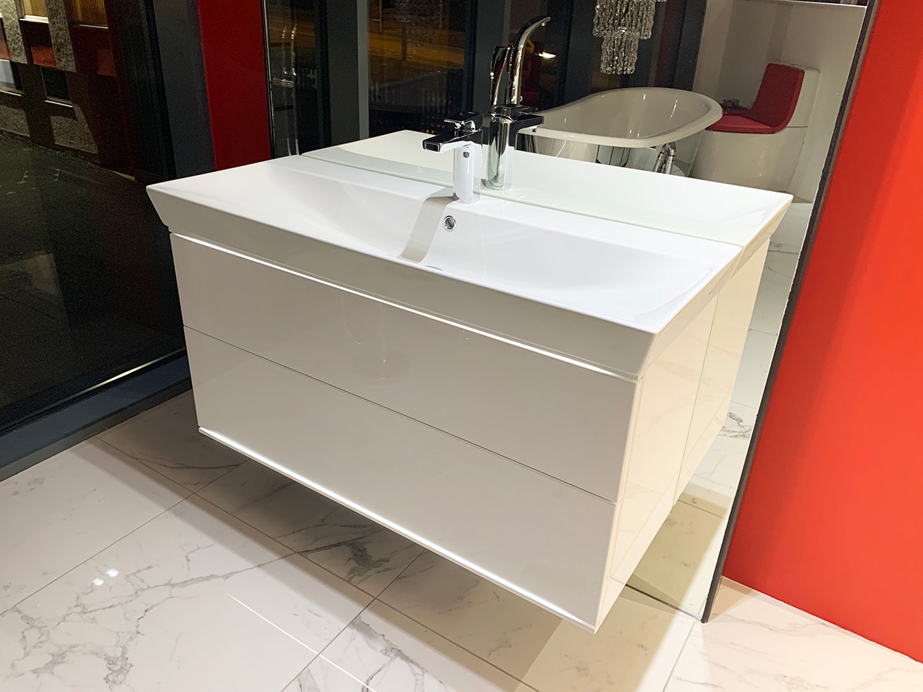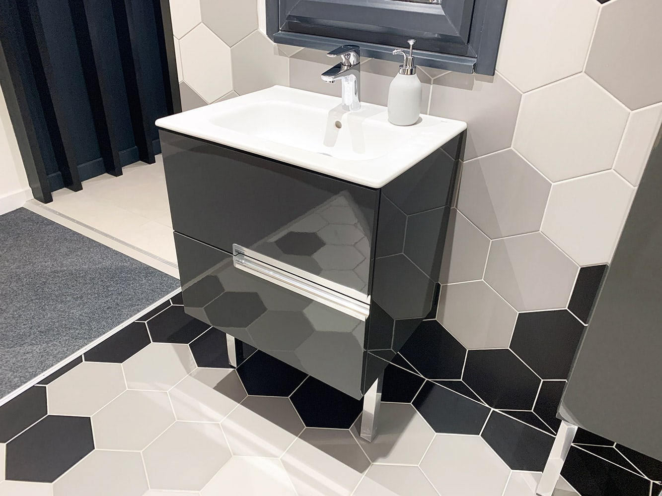 This showroom display features two pieces from Roca’s Victoria-N range – the base unit and the column unit. Both of these high-quality bathroom units are presented in a Gloss Anthracite colour, however, they are also available in Gloss White, Textured Oak or Textured Wenge finishes.