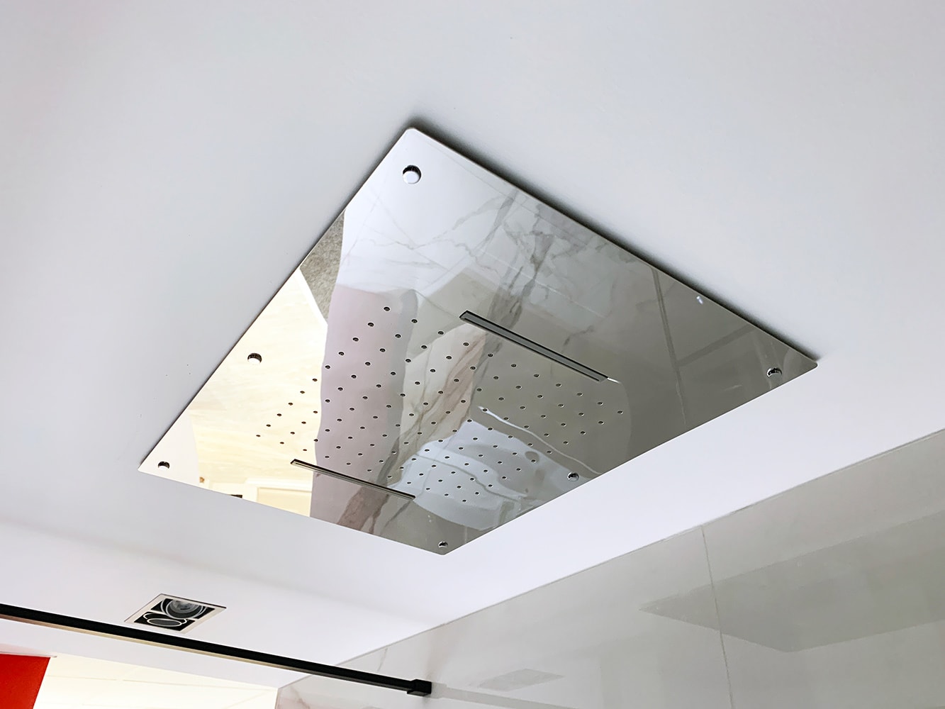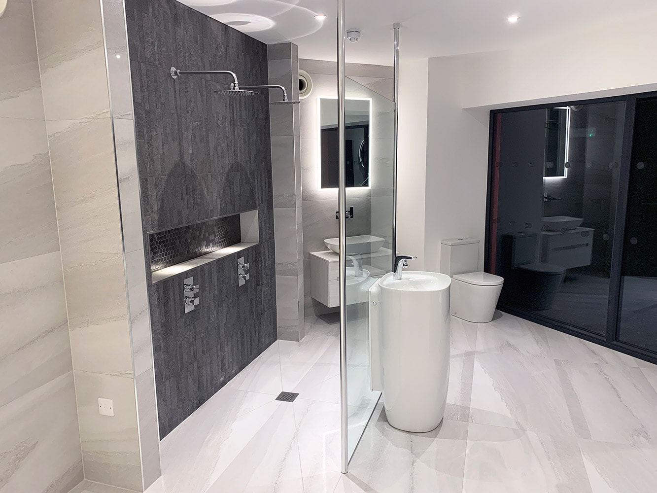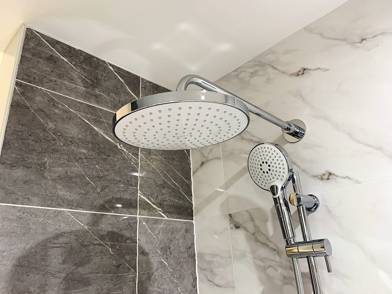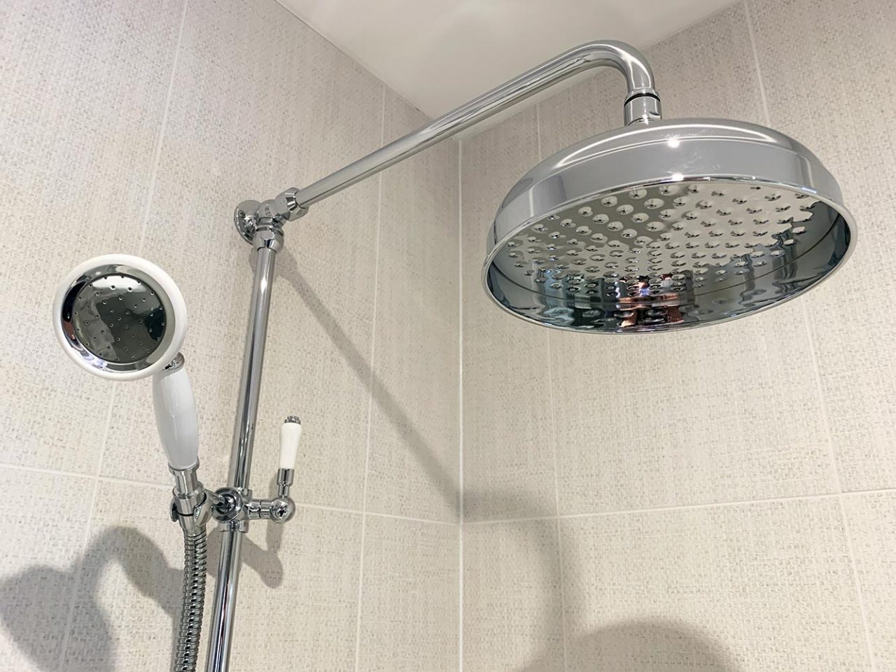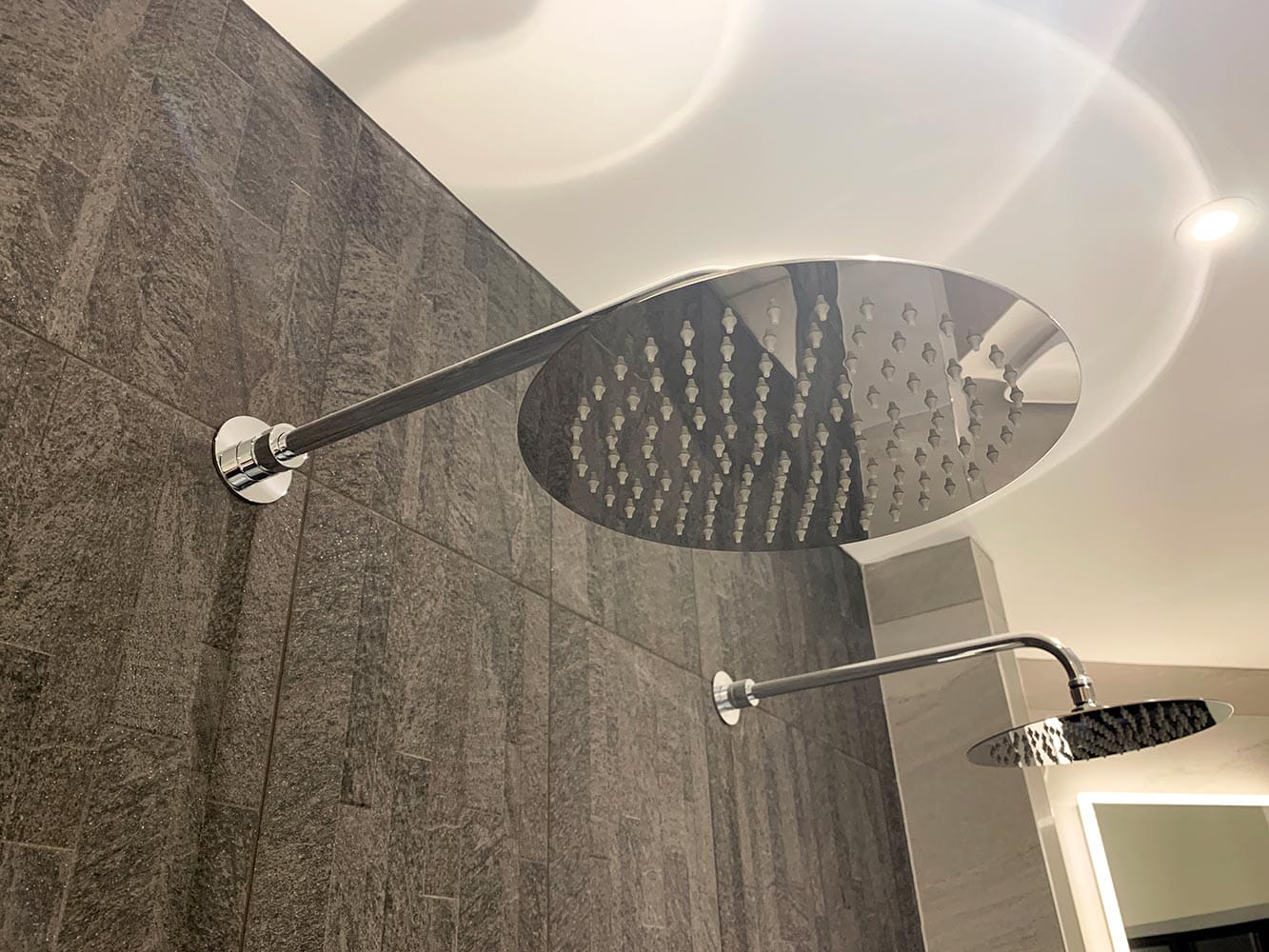 This spacious Wet Room display features twin Roper Rhodes Round 250mm Shower Heads in Polished Stainless Steel, each held in place by Roper Rhodes Adjustable Brass Fixed Arms in a matching finish.