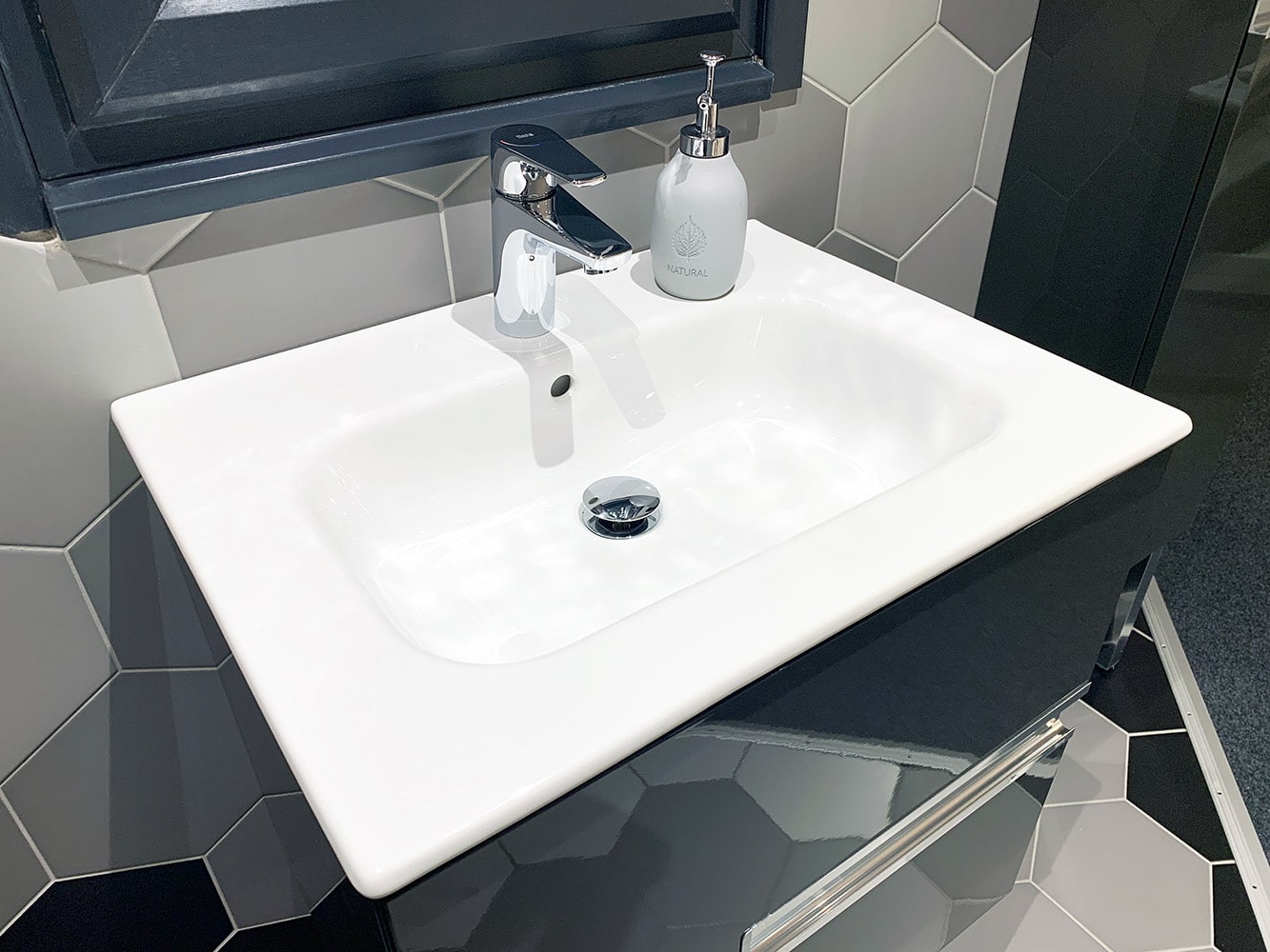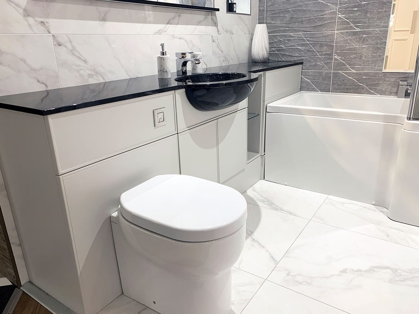 This display showcases contemporary fitted furniture by Mereway Bathrooms, finished with ‘Ely’ Light Grey Matt Doors and topped with a ‘Lustre Noir Reflect’ Worktop with Integral Semi-Recess Oval Basin. Fitted to the unit is the Hydra Basin Mixer in Chrome, to match the Bath Filler (available in a range of finishes including Brass and Matte Black).