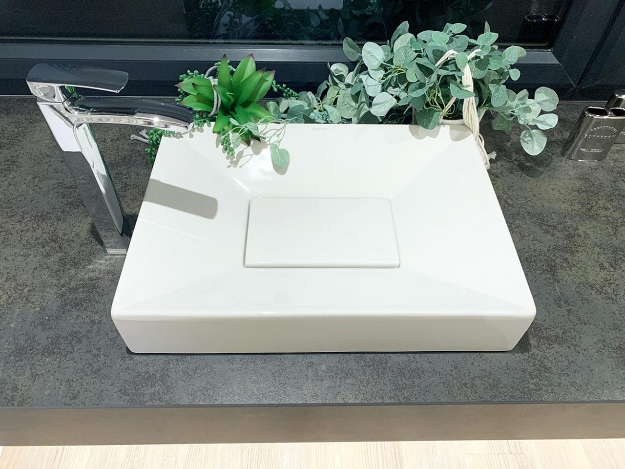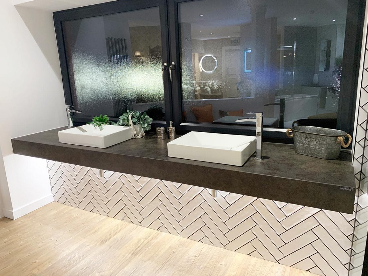 This showroom display has been designed to be bright and welcoming, with ample space combined with a minimalist style. Two Roper Rhodes Luca Basins are mounted upon a large Neolith countertop – a lightweight sintered stone surface that is also highly scratch resistant. The two basins are topped off beautifully with Roper Rhodes Sync Basin Mixer Taps and feature integrated click-wastes.