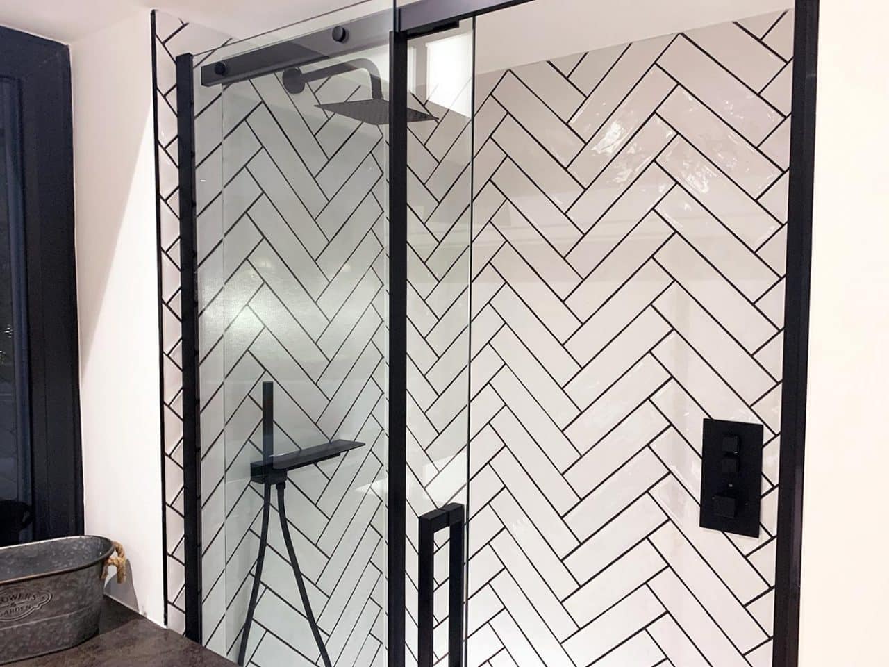 This display incorporates a ‘Squared Showerwall’ Merlyn Shower Screen, featuring a beautiful metal frame with horizontal and vertical bars. This Shower Screen comes with Merlyn’s Lifetime Guarantee and uses ‘Mershield’ stay clear technology to stay fog-free. The Merlyn Rectangular 25 Shower Tray with integrated waste cover sits flush with the surrounding tiles.