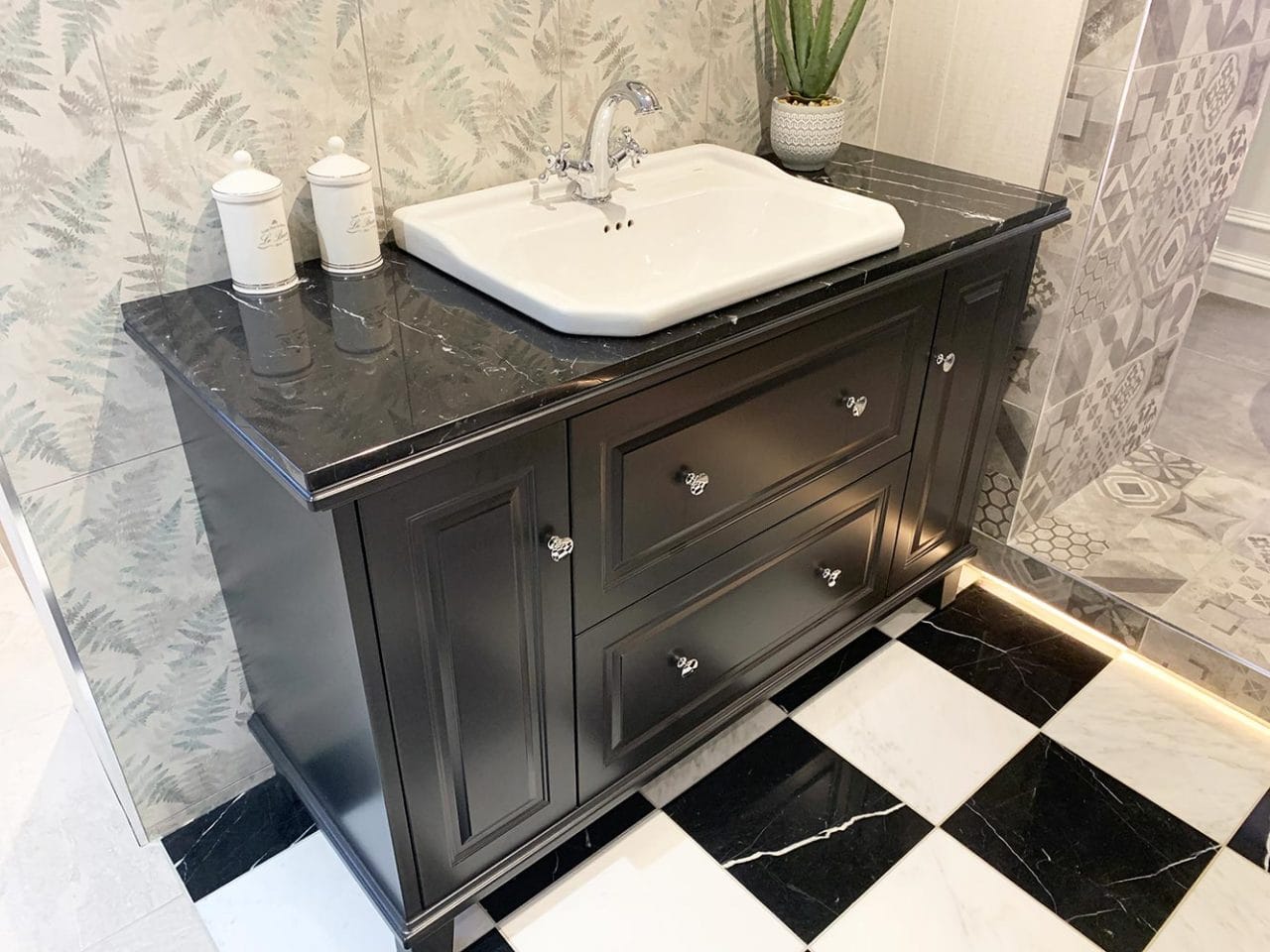 The Roca Carmen Base Unit is presented in a Satin Anthracite finish with a Marquina Black marble-effect countertop (this can also be customised with a Satin White base finish and a Veneto White marble-effect countertop).