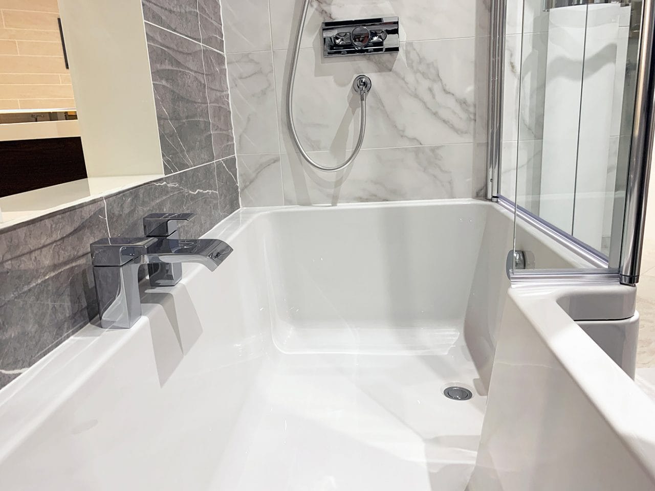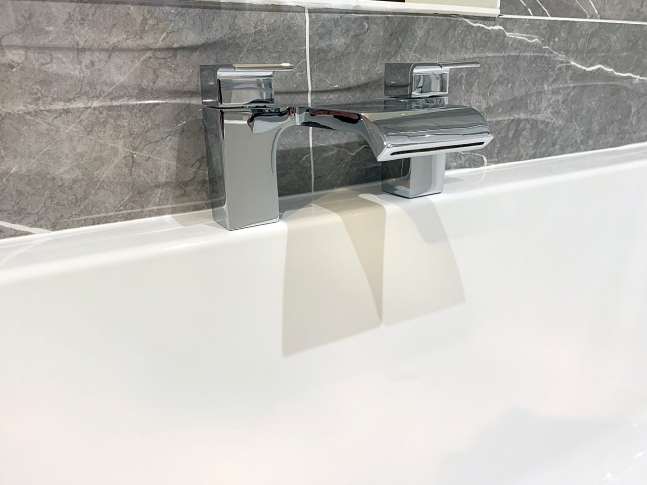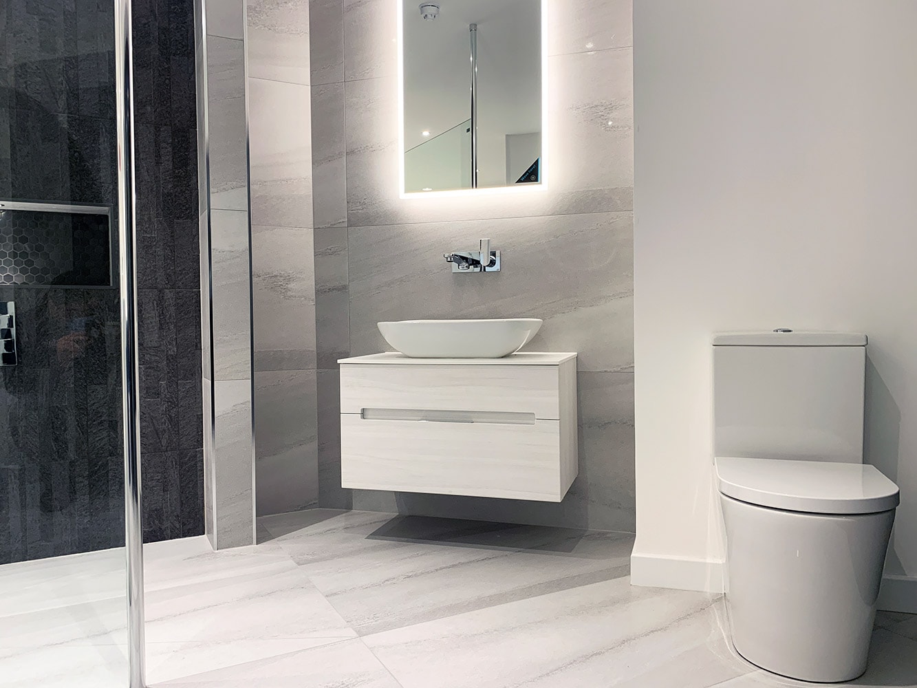 This display showcases contemporary fitted furniture by Mereway Bathrooms, finished in a Light Grey with ‘Ely’ Light Grey Matt Doors and topped with a ‘Lustre Noir Reflect’ Worktop with Integral Semi-Recess Oval Basin. Fitted to the unit is the Hydra Basin Mixer in Chrome, to match the Bath Filler (available in a range of finishes including Brass and Matte Black).