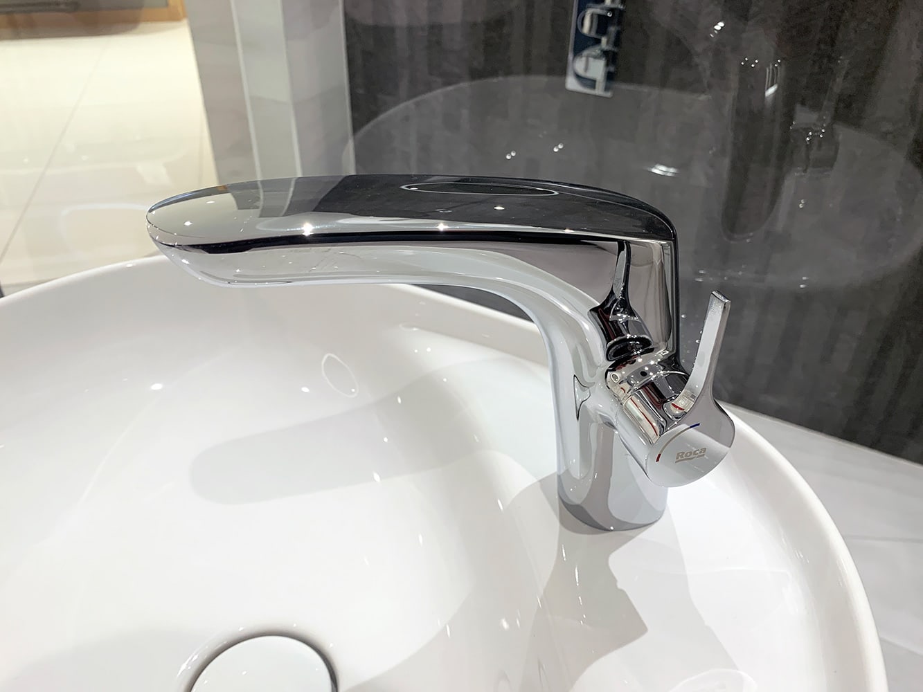 The Base Unit features a 600mm x 460mm Basin in a rounded-rectangular design – an oval basin style is also available. Fixed to the basin is the Roca Atlas Smooth-Body Basin Mixer Tap.