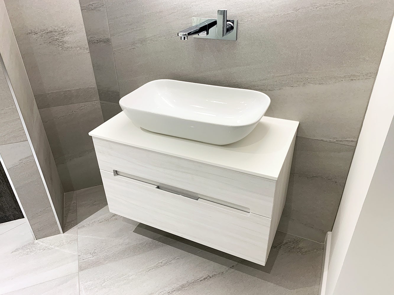 This display features a Rhoper Rhodes Diverge Wall-Mounted Bathroom Unit (800mm wide) with soft-close drawers and hidden handles. A Roper Rhodes Rapport Ceramic Vessel Basin, showcasing its high water capacity and smooth, sleek design, sits on top of the Diverge Countertop, creating a natural focal point.