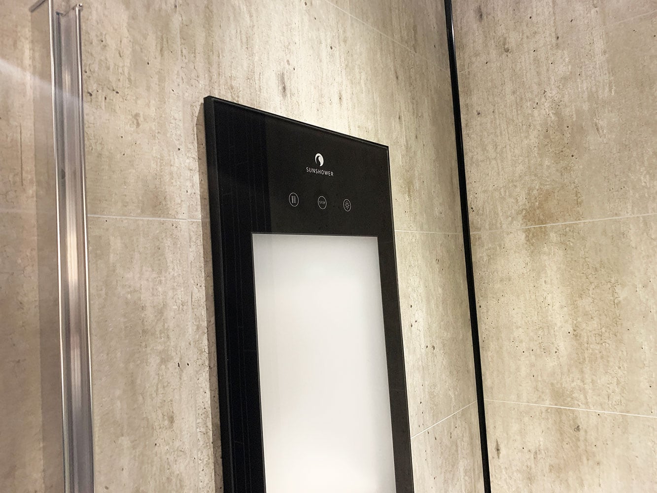 The Sunshower Deluxe features five 500W infrared light bulbs alongside four UV light bulbs. Integrated into the wall to take up minimal space, the system is fully waterproof and smoothly encased in aluminium with a specially treated glass covering.