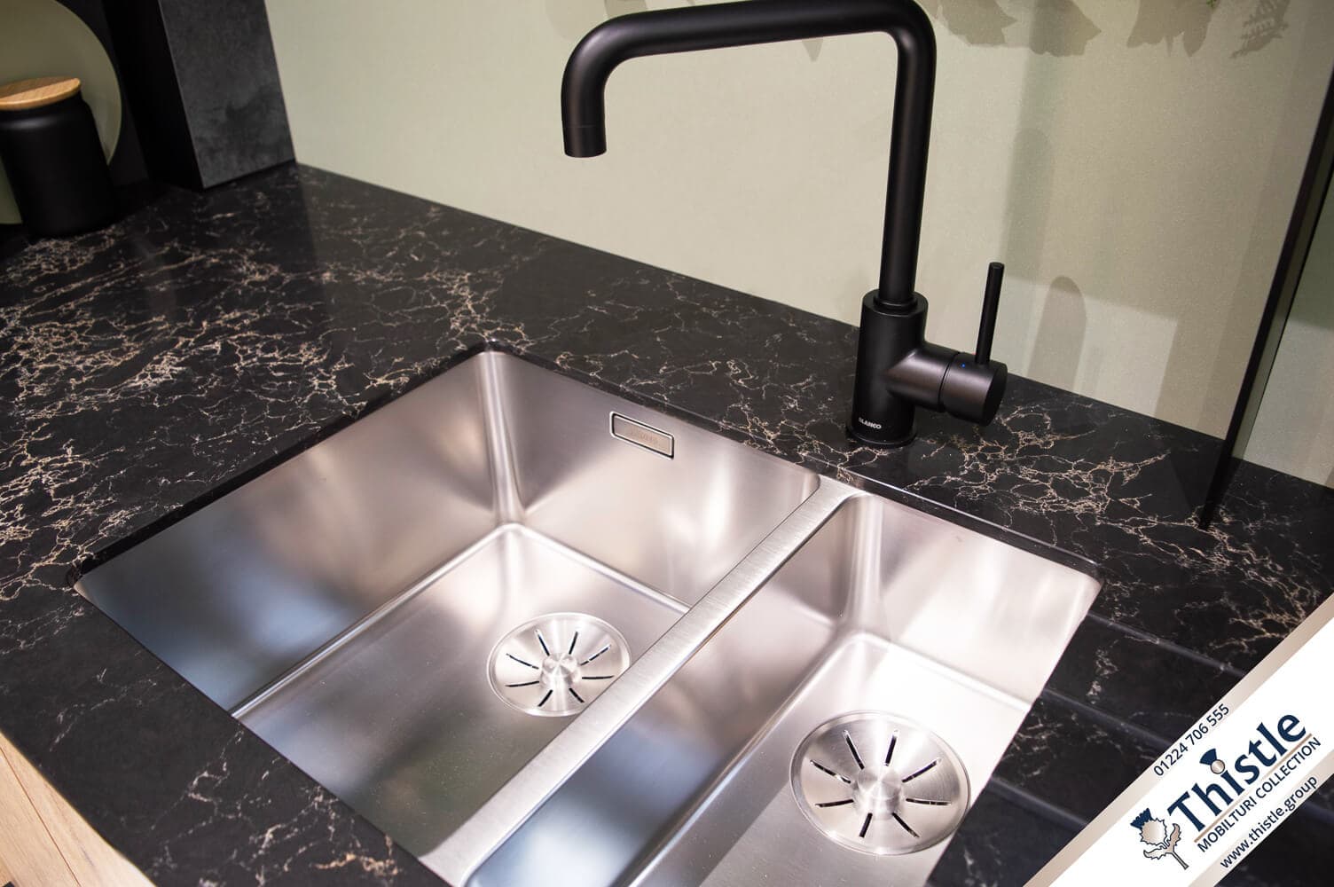 The main worktop used is Ceaserstone in a Vanilla Noir finish which also features moulded drainer channels for the undermounted Blanco Stainless Steel Sink. A Silestone Splashback in Posidonia Green adds a touch of pastel colour and highlights the practical totem shelving option.