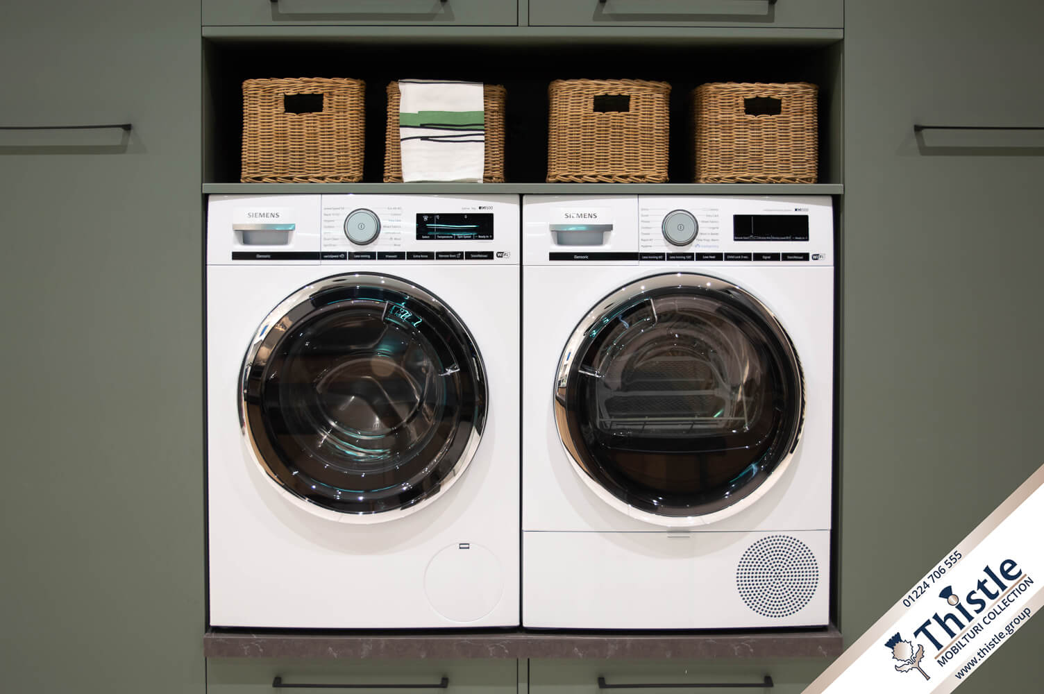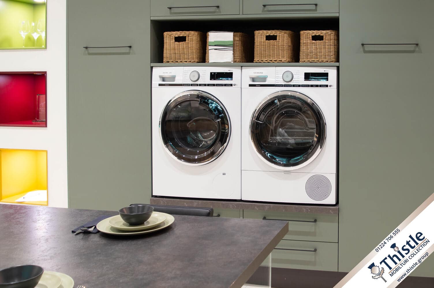 The utility area of this display uses Mobilturi’s Pop range Verde Muschio Opaco Doors and showcases a clever way of integrating and elevating the Freestanding Siemens iSensoric Washer and Dryer Units for ease of access.