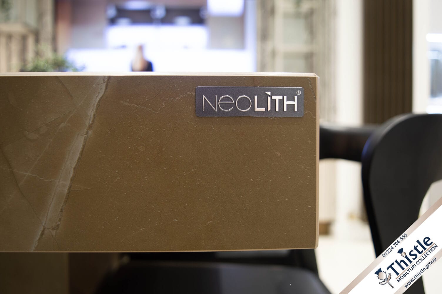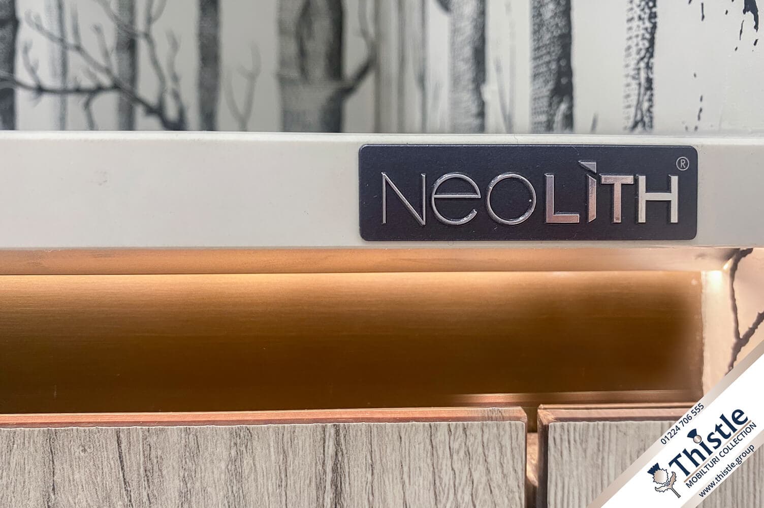 Neolith Sintered Stone is used throughout this display, including the Main Worktop and Upstand (Abu Dhabi White), and Door Fronts (Dark Pietra Grey) and is also used to form a stunning centrepiece Table (Pulpis Silk).