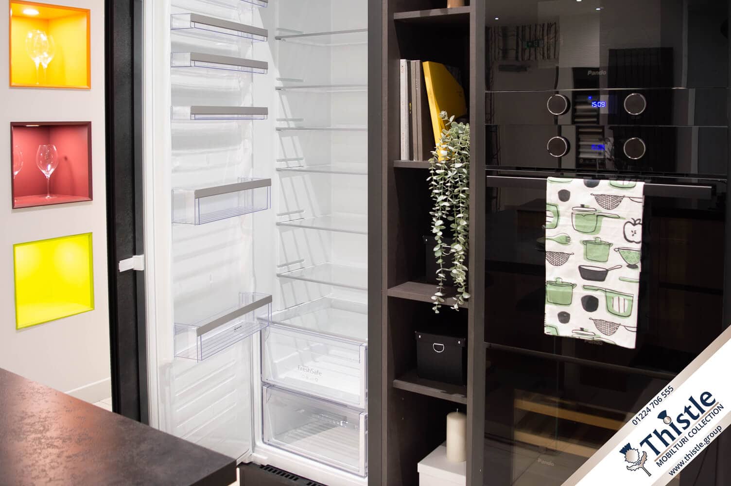 A Blanco Composite Stone Sink is used within this display, with Mobilturi’s innovative Slack Shelving (Boiserie Stripes) showcased directly above the Upstand. A large 90cm Fulgor Milano Oven is shown within this display, along with an Integrated Neff Fridge Unit and an Integrated Pand Compact Dishwasher.